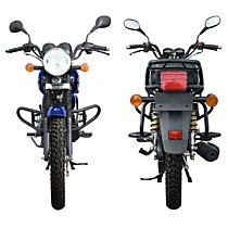 Вместительный бак, дуги безопасности, проверенные временем барабанные тормоза на переднем и заднем колесах, защитный кожух цепи, широкое и длинное сиденье и интегрированные в раму пассажирские подножки – все эти детали выдают утилитарное предназначение мотоцикла. Несмотря на классический «настрой», Regulmoto SK 150-20 отличается наличием массы актуальных решений: литые диски колес, современная приборная панель, световое оборудование на светодиодах, тумблер электростартера и остановки двигателя (кик-стартер также присутствует).